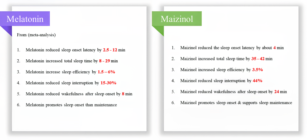 Multiple clinical studies have demonstrated that Maizinol® alone offers significant benefits in promoting quality, restorative sleep.13-15 In our comparative analysis against melatonin reported from Meta Analyses,16-21 Maizinol® was found to be more effective in maintaining sleep rather than initiating it. Therefore, Maizinol® use as a stand alone or in combination with melatonin especially for aging population may offer a complementary solution helping the body transition into sleep more quickly while also supporting uninterrupted, sustained rest.