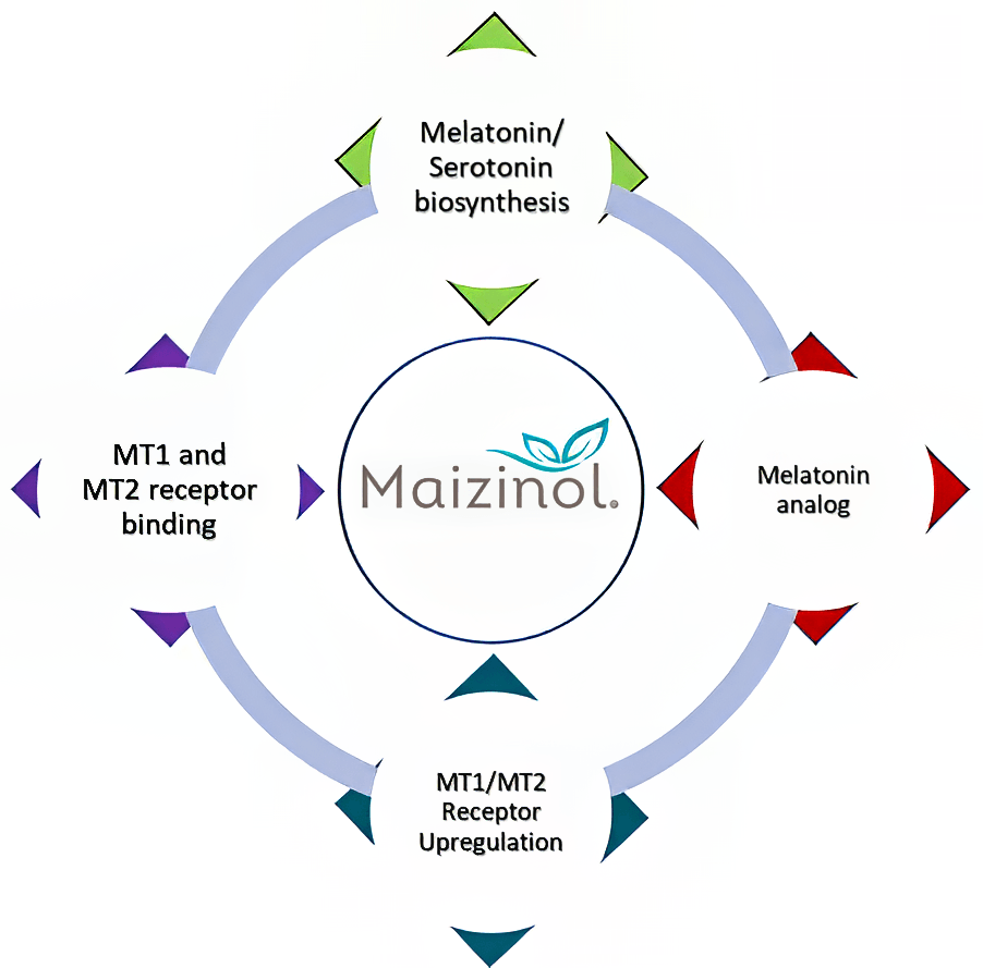This has led to interest in alternatives that stimulate the body’s natural melatonin production. Until recently, options for promoting endogenous melatonin synthesis were limited. Unigen’s Maizinol®, a hormone-free, standardized corn leaf extract, has been shown to have triple actions: 1. to support the body’s own melatonin production; 2. upregulate its MT1 and MT2 receptors at gene and protein levels; 3. binding directly to MT1 and MT2 receptors.12,13 These mechanisms give Maizinol® a competitive advantage for those who are sensitive to melatonin supplements or who prefer a more natural approach to sleep support.