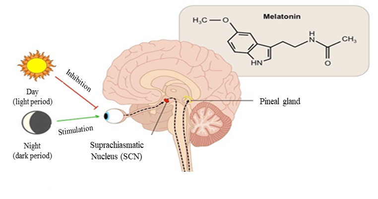 Figure 1: Melatonin is produced by the pineal gland and regulated by SCN